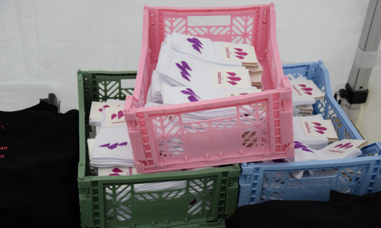 Produkt: strumpor med egen logotyp och märkesetikett i kartong. 3 olika storlekar (35-38, 39-42, 43-46) Pris med logotyp: 200 st – 6,90 €/par (moms 0 %). Minst 100 par/storlek.
